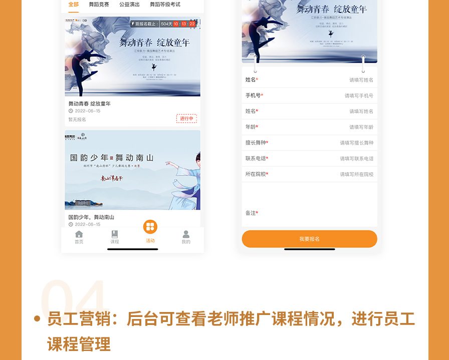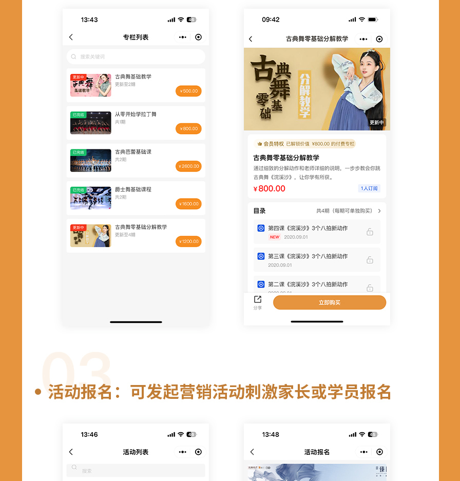 课程预约,课程直播,知识付费,活动报名,学员维护,让服务与营销融为一体,帮助中小教育机构搭建在线教育平台